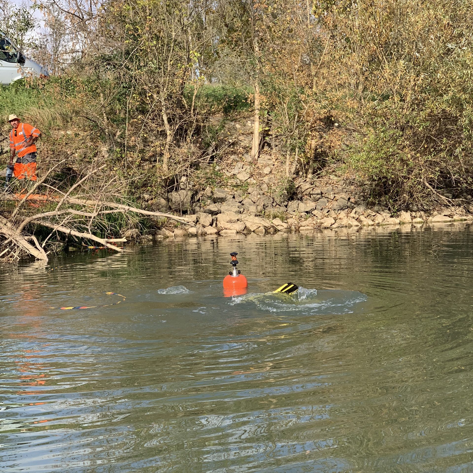 Grâce à ce dispositif, les experts Detect Réseaux ont pu détecter le fil depuis les berges de la Saône de manière classique. Les informations du plongeur étaient visibles sur le détecteur de l’équipe à terre.